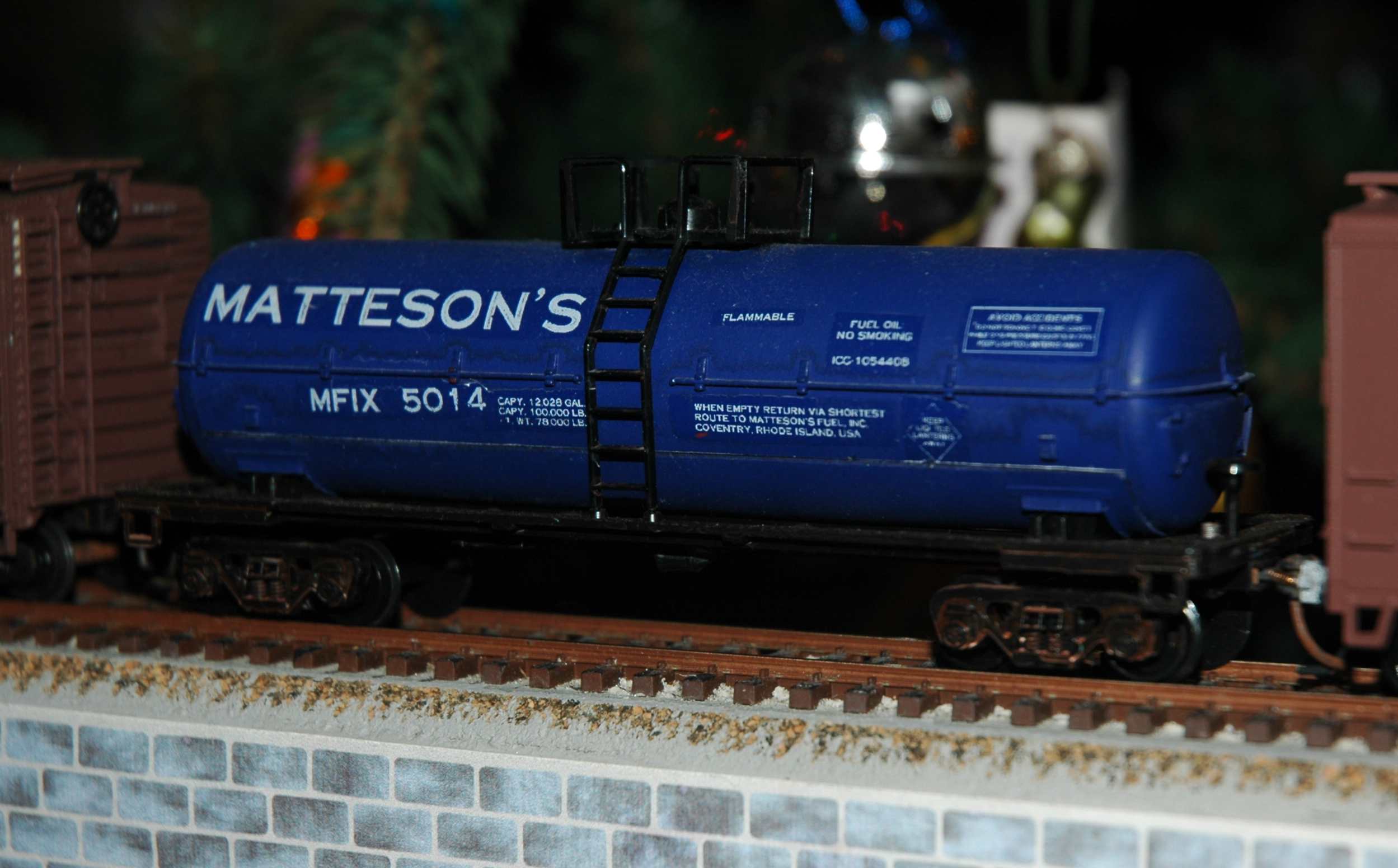 The Freight train was played by: Spectrum 4-8-2 Mountain (runs OK, looks cool) and Matteson's Fuel tank cars (my Father-In-Law's old fuel oil business gone Big Oil). Hey, my Alps decal guy didn't come through!