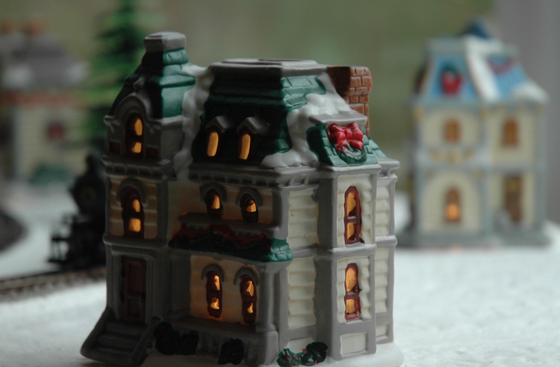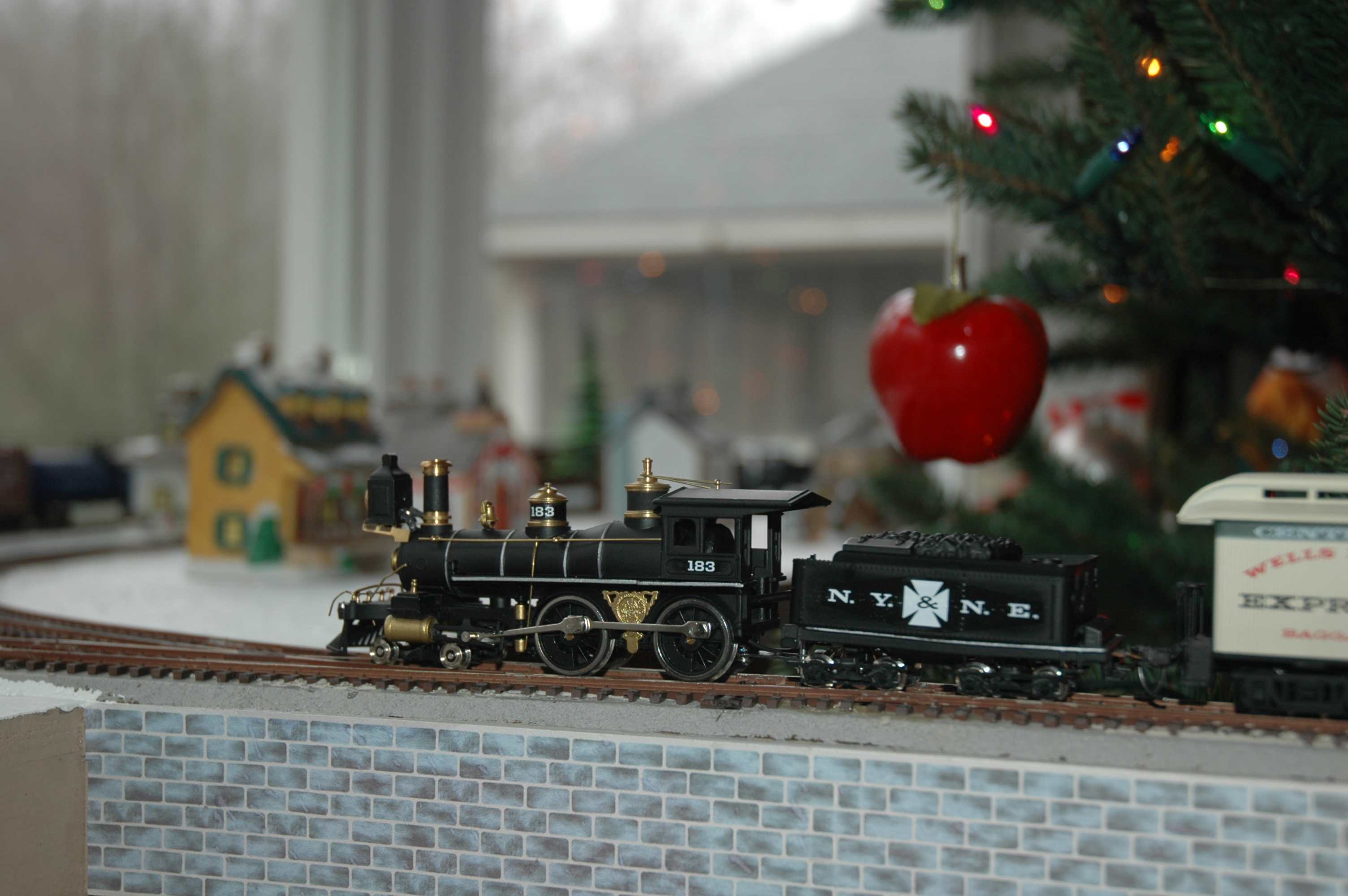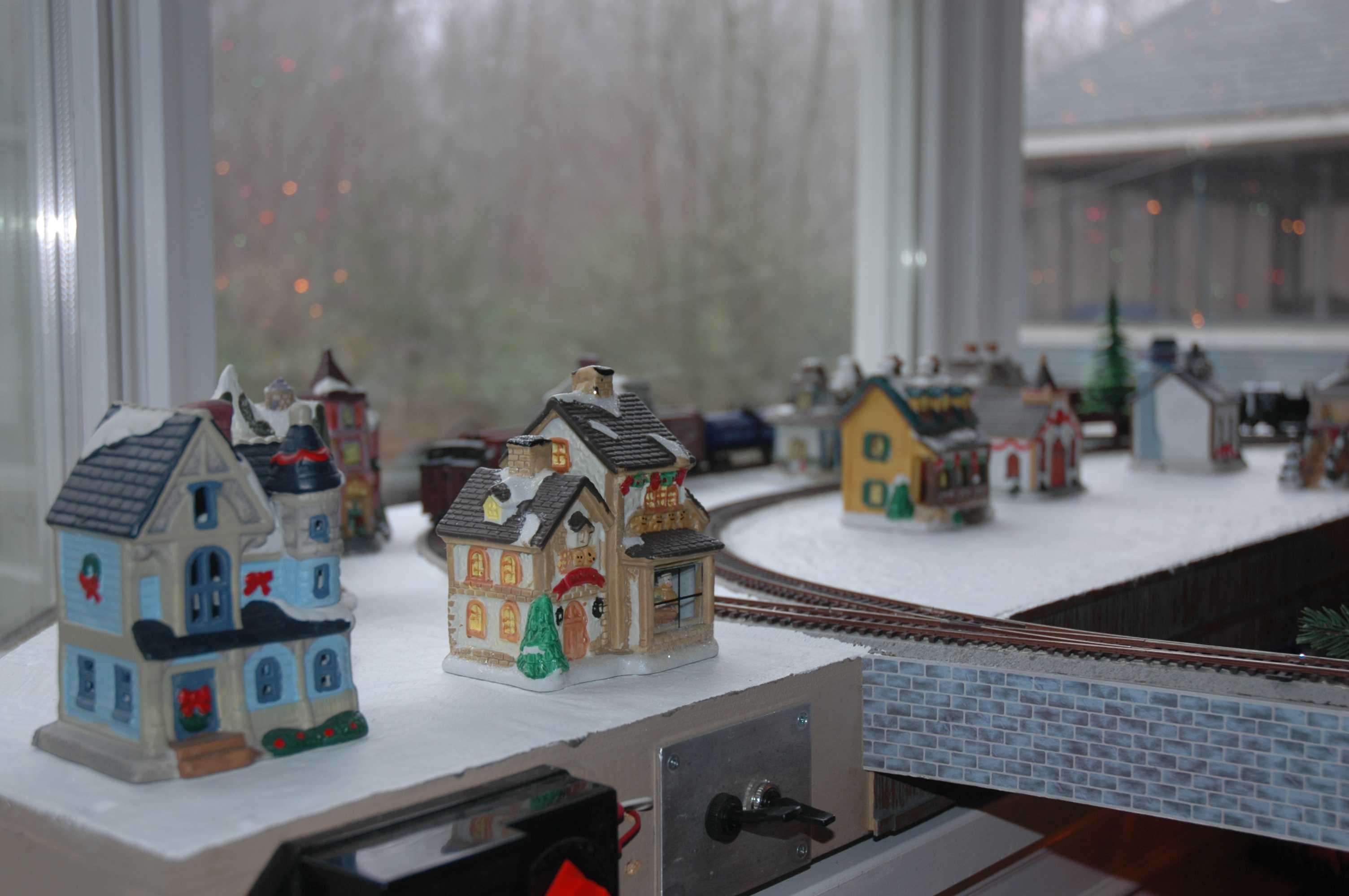 The idea was a train going around the Christmas tree (not much new there), but the tree always goes in front of the bay window.... and besides, you shouldn't run them on the floor (dog hair and all that). So why not...